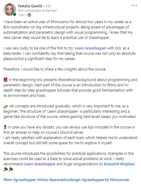 "I particularly enjoyed the very structure of the course - how it's been divided and neatly segmented into easily digestible sections. The videos are accompanied by practical exercises. Additionally, the content is based on real-life scenarios, which renders the entire experience credible and appealing. The author of the course comes across as a really approachable, professional, and easy-going expert, who is simultaneously a proficient speaker capable of conveying messages in a highly engaging and understandable manner. It embraces all the essential prerequisites to implement parametric design in our daily jobs."