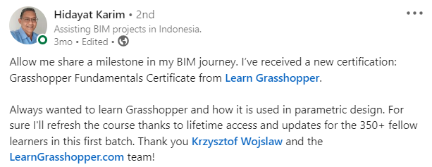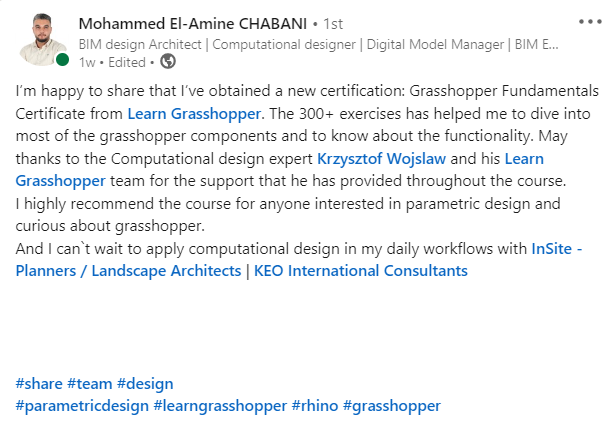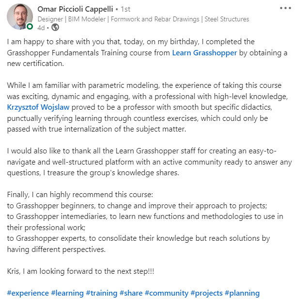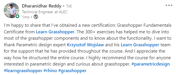 "I would like to express my sincere thanks for the Grasshopper course, and the way you presented the material made Grasshopper more understandable and accessible and special thanks for the quality of the content. Really the content of course is very fantastic."