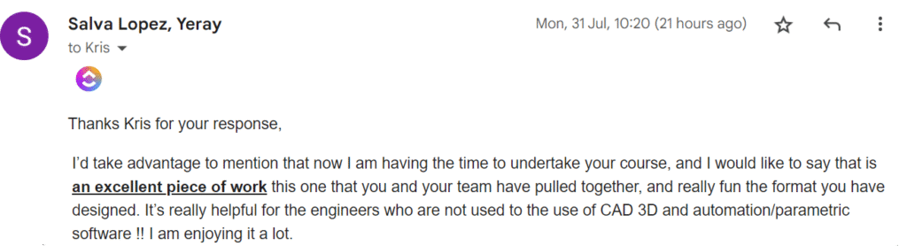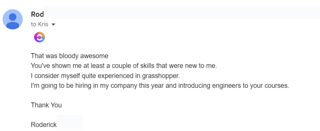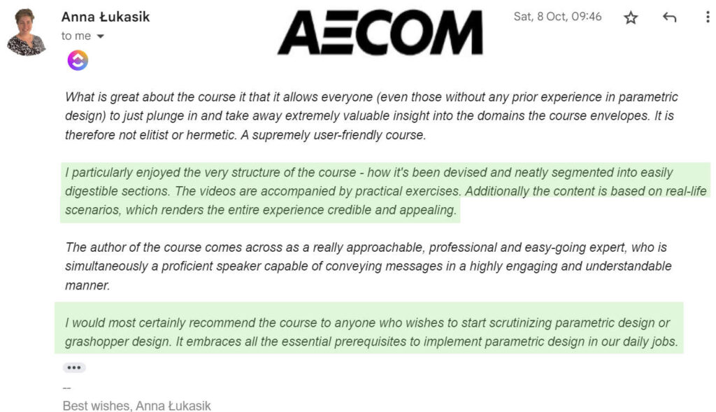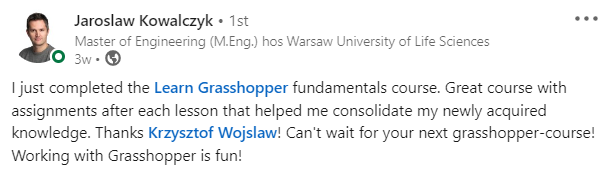 “The course was excellent — the explanations and examples helped me understand Grasshopper much better. I definitely recommend it.”