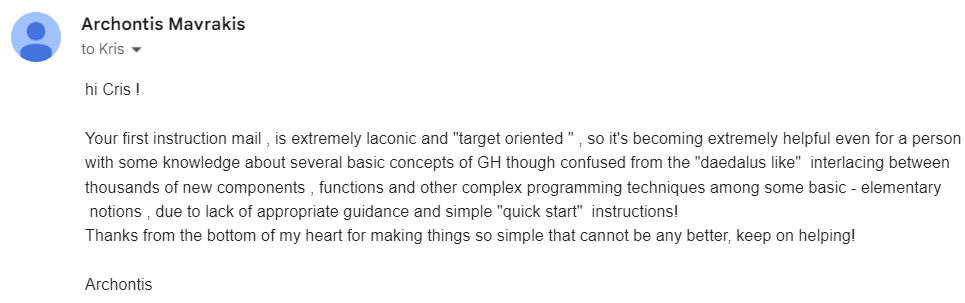 "Thank you for all of your work, in my mind you are one of the best Grasshopper educators out there right now!! And your content is really clear and helpful! Thank you, and best of luck!"