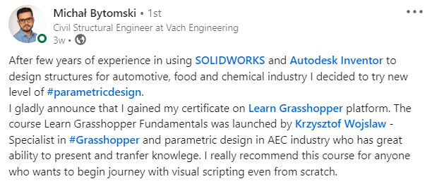 “I had some doubts about joining a beginners course since I was already experienced in parametric design But luckily I got more than I expected from these lectures. (...) Active community in Discourse provided quick responds to any questions or concerns that I had, making the learning experience even more valuable."